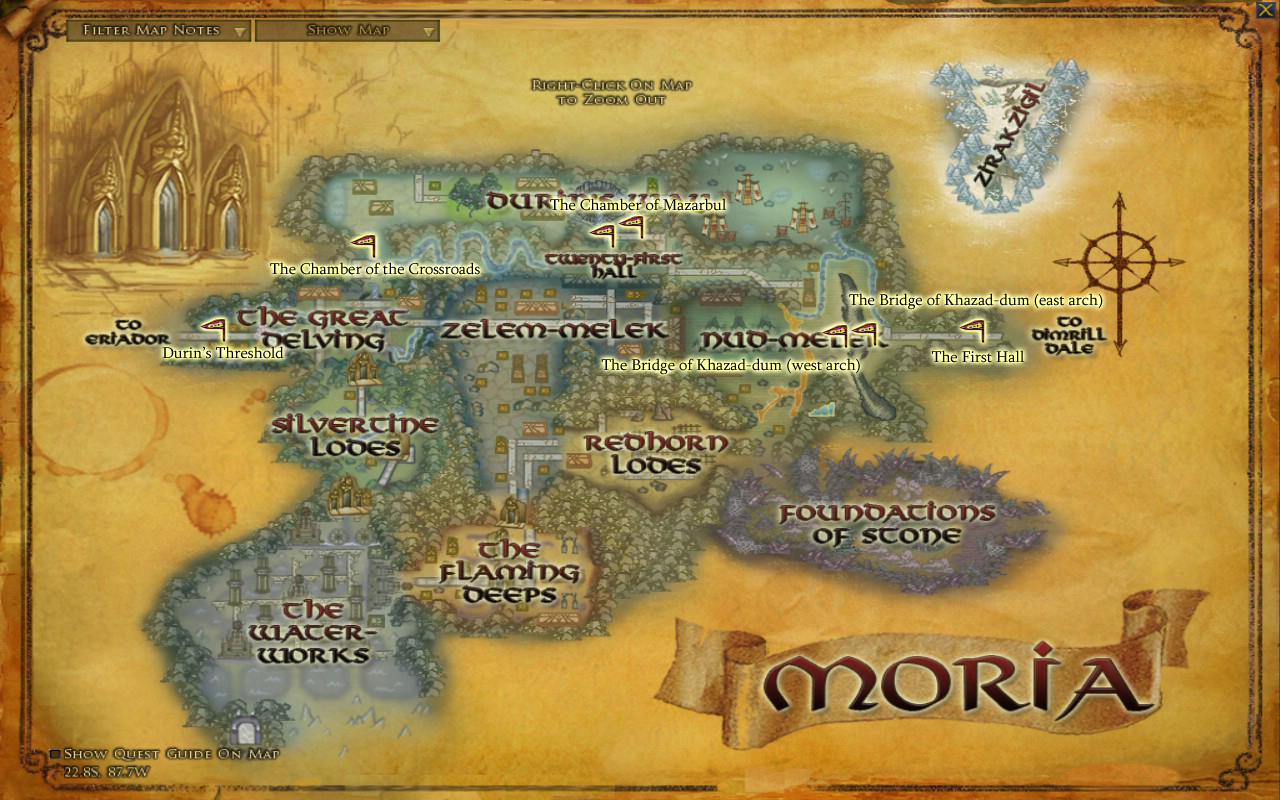 (4.8S, 105.3W) It is likely that the Chamber of Mazarbul once served some great ceremonial purpose in the old days of Moria; now it remains the tomb of Balin, son of Fundin and friend to old Bilbo, who, not so many years ago, led an expedition much like the current one to retake Moria and restore it to the glories of old. |