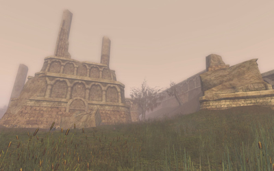 (35.7S, 51.6W) These ruins, an abode of vile brigands from the south, mark the passage from the Vale of Andrath southwards into long-abandoned Minhiriath. |